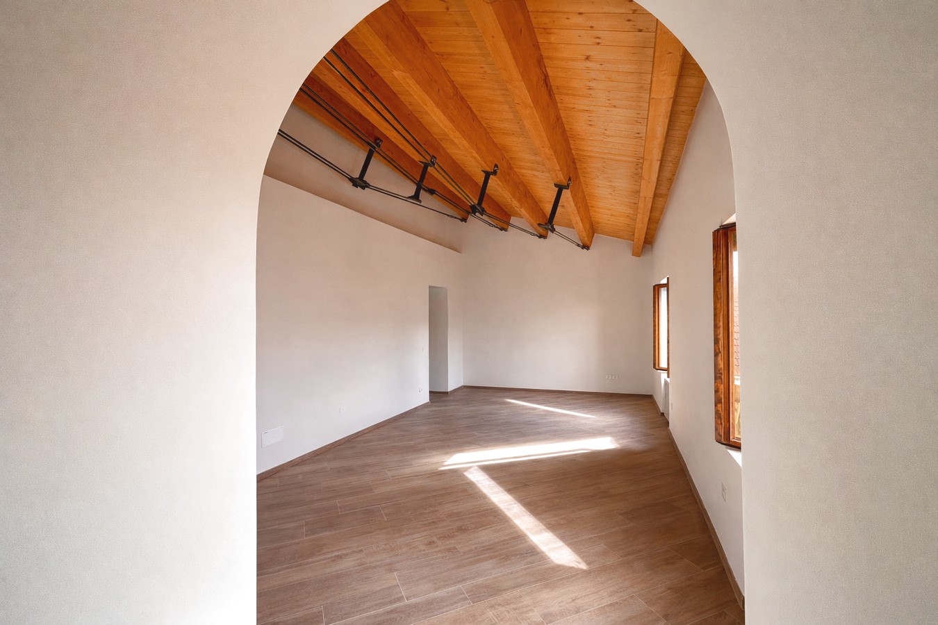 · High ceilings with contemporary exposed wooden beams