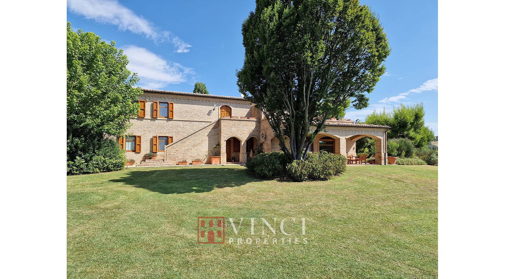 Casale ristrutturato in vendita nella regione delle Marche con giardino e una splendida piscina, a soli 15 minuti dalla costa adriatica e dalla vivace cittadina di Civitanova Marche e a circa cinque minuti dal pittoresco borgo collinare locale. La casa è stata completamente ricostruita sul luogo di un ex casale, utilizzando materiali originali in tutto. La sua posizione, privata ma non isolata, offre un panorama mozzafiato. Rivolta completamente a sud, la villa gode di ampie vedute che si estendono dalle colline circostanti fino al mare Adriatico. Il giardino recintato di 4150 mq è ben curato e offre abbondante spazio per rilassarsi e giocare. Sul retro della casa, c’è un orto e un’ampia dependance di 40mq utilizzata come rimessa attrezzi. Il casale si sviluppa su due piani per un totale di circa 400 mq oltre a portici e terrazzi: